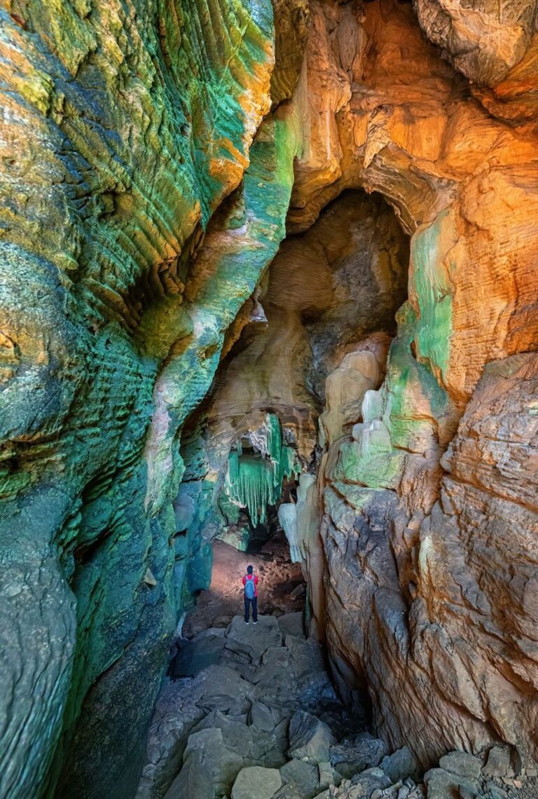 ग्रीन गुफा तक पहुंचने का मार्ग बड़े-बड़े पत्थरों से होकर गुजरता है। गुफा में प्रवेश करते ही सूक्ष्मजीवी जमाव से ढकी हरी दीवारें पर्यटकों को आकर्षित करती हैं। आगे बढ़ने पर एक विशाल कक्ष दिखाई देता है, जहां से भीतर की ओर चमकदार और विशाल स्टैलेक्टाइट्स तथा फ्लो-स्टोन (बहते पानी से बनी पत्थर की परतें) देखने को मिलती हैं, जो गुफा की प्राकृतिक भव्यता को और भी बढ़ा देती हैं।